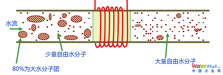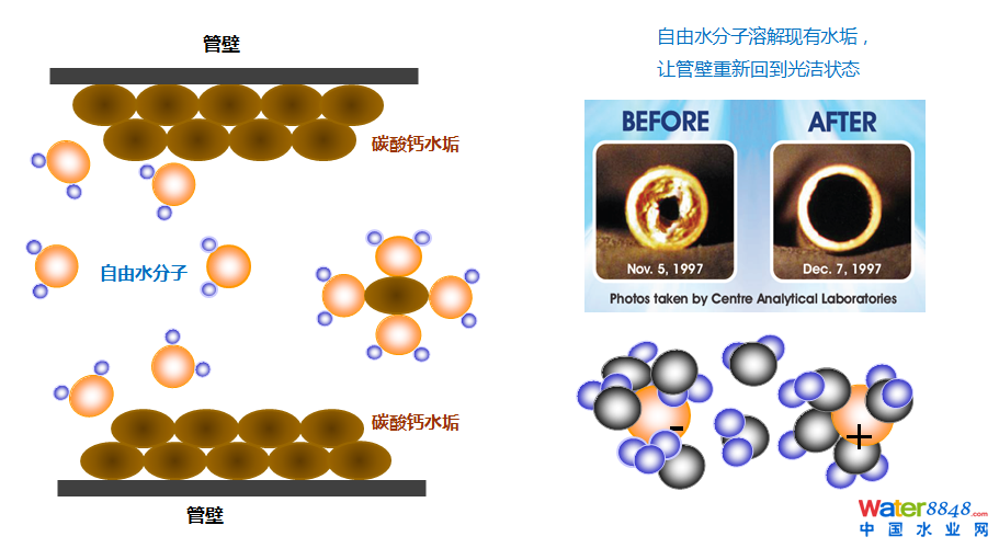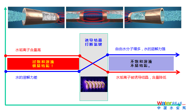 在調(diào)頻磁場的影響下,離子頻繁碰撞結(jié)晶,碳酸鈣晶體長大,這種晶體表面不帶電荷,性質(zhì)穩(wěn)定,不會粘附在管壁上;