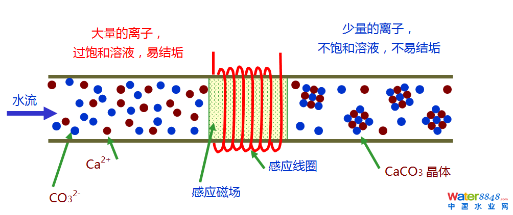 利用纏繞在管路上的線圈產(chǎn)生調(diào)頻感應磁場,使得水垢離子頻繁碰撞,主動結(jié)晶析出,生成納米級的CaCO3晶體,這種晶體不會黏附在管壁上,處理后的水垢離子減少,從過飽和狀態(tài)變成不飽和狀態(tài),從而防止換熱表面結(jié)垢。