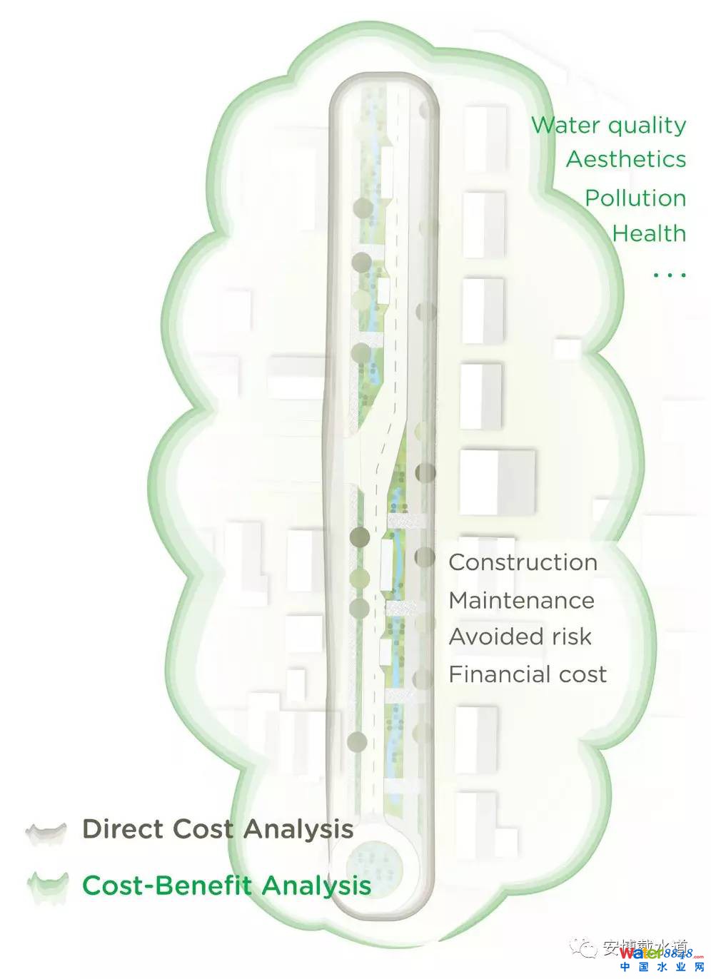 相關(guān)利益部門利用預(yù)先確定的用于滯留或輸送洪水的藍(lán)綠基礎(chǔ)設(shè)施元素繪制出自己的暴雨管理方法圖。藍(lán)綠基礎(chǔ)設(shè)施元素包含: