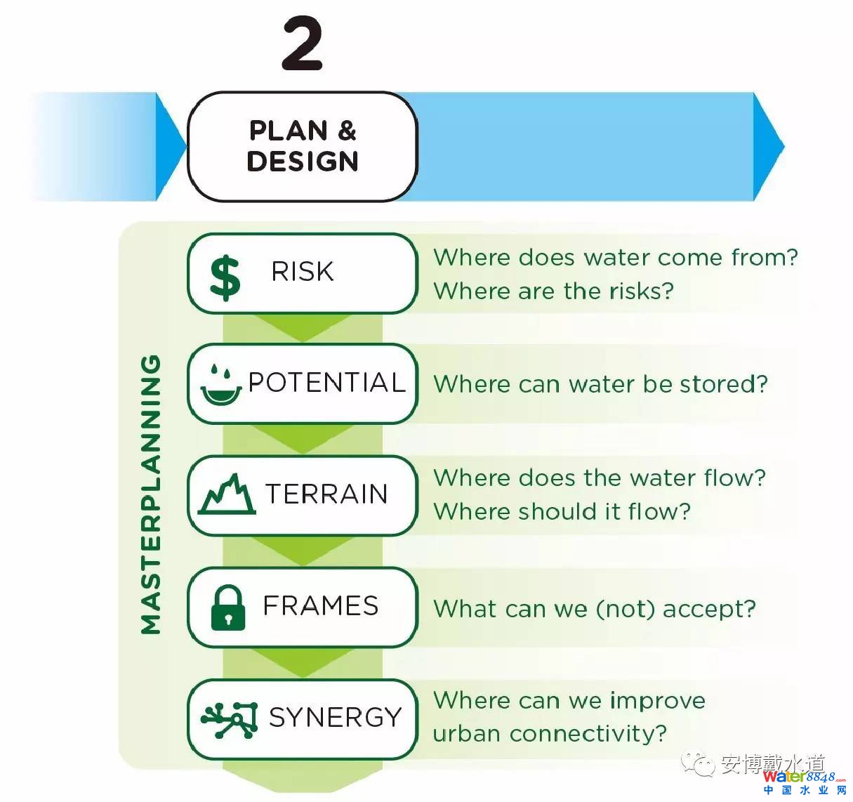上圖總結(jié)了對形成總體規(guī)劃實際設(shè)計的綜合考慮。相關(guān)利益部門將仔細(xì)審查設(shè)計師和工程師調(diào)研和設(shè)計洪水流向、洪水存儲及輸送地帶的過程,從而對決策框架的制定或決策應(yīng)用給出限制或支持意見,并最終確定該規(guī)劃與其它城市環(huán)境規(guī)劃的結(jié)合點,如公園或自行車車道。相關(guān)利益部門可多次審查規(guī)劃設(shè)計,每當(dāng)有新的發(fā)現(xiàn)時須隨時更新并改善設(shè)計。