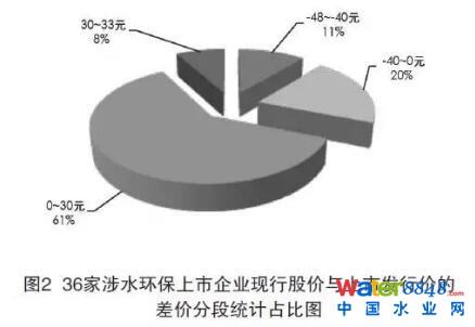 上市公司在經(jīng)營過程中,上市發(fā)行價有升有降,本次統(tǒng)計以36家涉水環(huán)保上市企業(yè)2017年4月28日的收盤價作為現(xiàn)行股價,并與上市發(fā)行價作比較。這個比較可以說明股市投資的效果和投資者的決策能力,也間接表明了上市公司經(jīng)營業(yè)績的好壞,F(xiàn)行股價與上市發(fā)行價的差價分段統(tǒng)計見圖2。