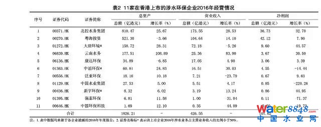 11家在香港上市的涉水環(huán)保企業(yè)2016年總資產(chǎn)額達1826.22億港元,同比增長18.66%;營業(yè)收入總額達426.54億港元,同比增長16.76%;凈利潤總額達101.62億港元,同比增長20.10%。