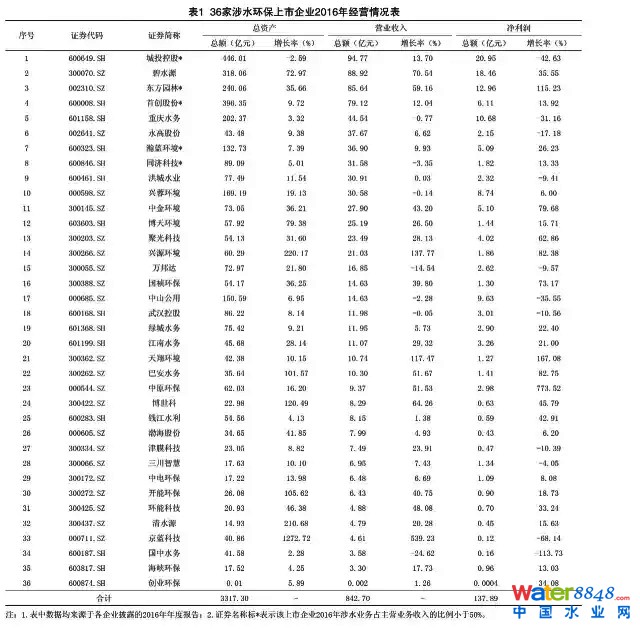 36家涉水環(huán)保上市企業(yè)2016年總資產(chǎn)總額達3317.30億元,同比增長20.73%;營業(yè)收入總額達842.70億元,同比增長22.34%;歸屬于上市公司股東的凈利潤總額達137.89億元,同比增長-0.21%。