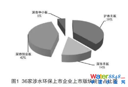 上市企業(yè)可以根據(jù)企業(yè)自身的情況和特點選擇上市的交易所和版塊。深市分主板、創(chuàng)業(yè)板和中小板,滬市只有主板。36家涉水環(huán)保上市企業(yè)中滬市主板有14家,深市主板有5家,深市創(chuàng)業(yè)板有15家,深市中小板有2家,見圖1。可以看出,36家涉水環(huán)保上市企業(yè),主板上市占據(jù)主體,占總數(shù)的53%,創(chuàng)業(yè)板占42%,中小板占5%。