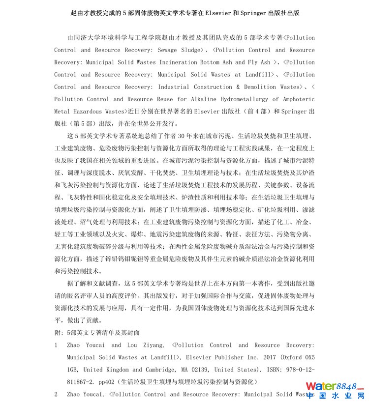 趙由才教授完成的5部固體廢物英文學(xué)術(shù)專著在Elsevier和Springer出版社出版