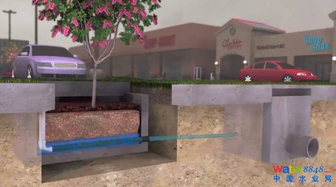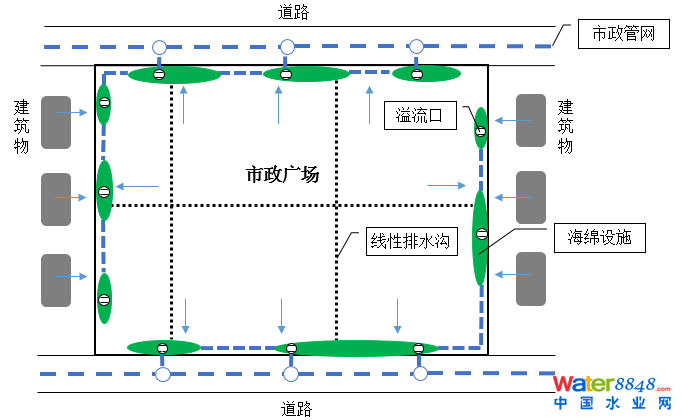 ④市政廣場的海綿設施均設置溢流管,超過設計標準的雨水溢流入市政管網(wǎng)。