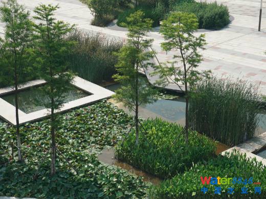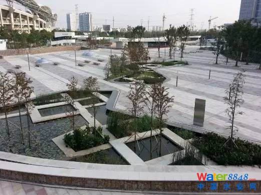 ③廣場的硬質鋪裝也可設置雨水濕地或地下式蓄水池,用來收集周邊硬質鋪裝的雨水徑流,凈化后可用于綠化澆灌、鋪裝沖洗。