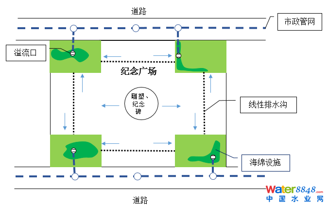 ④紀念廣場的海綿設施均設置溢流管,超過設計標準的雨水溢流入市政管網(wǎng)。
