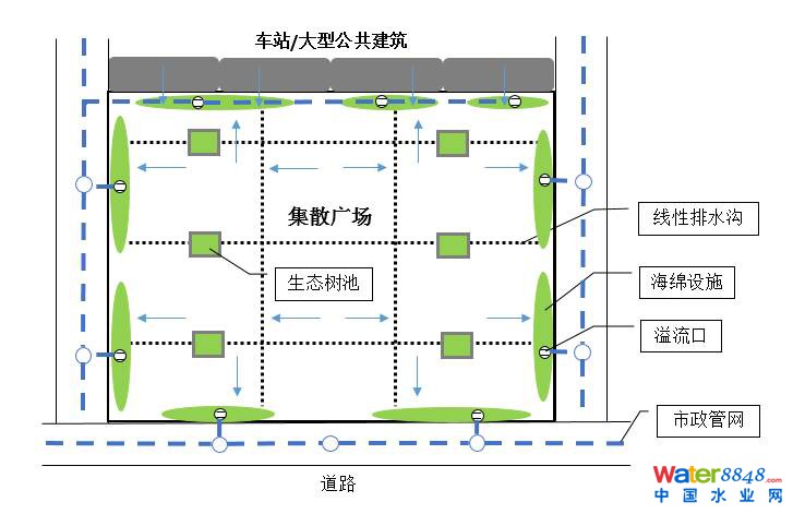 ③集散廣場一般以硬質鋪裝為主,宜采用透水鋪裝,同時設置線性排水溝或植草溝,雨水徑流通過有組織的匯流與轉輸,引入周邊綠地海綿設施。
