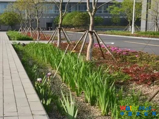 ③市政廣場周邊的綠地宜與道路、建筑設計相結合,可運用的海綿設施有生物滯留池、生態(tài)樹池、高位花壇、植草溝等。