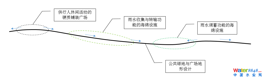 ③休閑娛樂廣場功能分區(qū)較為明確,海綿設施設計應結合不同功能區(qū),合理布置海綿設施。