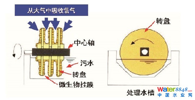 生物轉(zhuǎn)盤作為生物法處理廢水的技術(shù)之一,其利用的是自然界中微生物群新陳代謝的生理功能對廢水中的有機污染物進行處理。微生物附著生長在盤上,浸沒在氧化槽中的那部分盤片中的微生物與氧化槽中的污水進行接觸吸附,盤片在轉(zhuǎn)動裝置的帶動下低速轉(zhuǎn)動,當浸沒部分離開氧化槽時,污水在盤片表面形成水膜,水膜從空氣中吸收氧氣,使生物膜在好氧條件下分解吸附的有機物。這樣,盤片在不斷轉(zhuǎn)動中,與廢水和空氣交替接觸,進行吸附-吸氧-氧化分解的循環(huán)過程,使污水得到凈化。同時盤片上的生物膜不斷生長、增厚、老化的生物膜靠盤片轉(zhuǎn)動的剪切力脫落下來,生物膜得到更新。