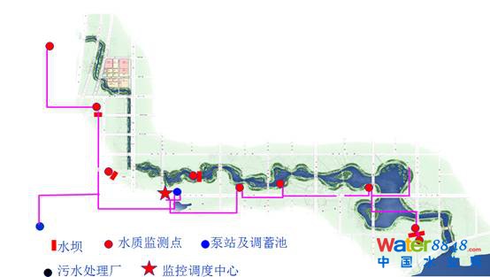 合肥市濱湖新區(qū)是國家城市生態(tài)建設的試點區(qū),塘西河橫穿濱湖新區(qū)中部,自西北向東南流入巢湖。河道城區(qū)段全長11.53km,流域面積50平方公里。作為一條半丘陵地形、城市雨源型河道,塘西河在改造前具有如下典型特征:①河道基本沒有生態(tài)基流,河水干枯,②旱季成為區(qū)域的納污河道,③雨天成為城市區(qū)域的泄洪、排澇通道。導致該河道旱季污水橫流、雨季洪澇泛濫。為此,在2006年濱湖新區(qū)開始啟動建設之際,合肥市政府就下決心對塘西河進行綜合整治,在保證區(qū)域防汛安全的基礎上,將其打造成一條“安全、和諧、生態(tài)”的城市濱水空間和景觀走廊,水質(zhì)目標達到Ⅳ類地表水環(huán)境質(zhì)量標準。作為總體設計單位,上海城建總院經(jīng)過歷時一年的大量調(diào)查研究,提出“五管齊下”的綜合整治策略,即:河道整治、污染治理、水源補給、生態(tài)重建和監(jiān)控調(diào)度。