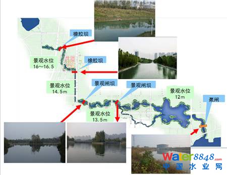 2、解決河道補水、蓄水問題。李村河上游結(jié)合河道地形地貌和景觀設計建設多級蓄水壩,將流動的小股河水轉(zhuǎn)化為動態(tài)溪流景觀,補水源主要有上游水庫、世園會水質(zhì)凈化廠(6000噸/日)。在李村河下游整治中,結(jié)合河道清淤后的河底標高以及整體河道的坡向變化,建設1座擋潮閘、5座橡膠壩、11座剛性壩、2座剛壩閘等攔蓄水設施,在不影響行洪的前提下通過分級設壩的方法積蓄雨水,總蓄水量約140萬立方,同時,沿河規(guī)劃建設再生水管道11公里,以李村河污水處理廠中水作為河道補給水源,以此實現(xiàn)“河流”變“河湖”。
