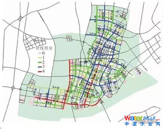 管線規(guī)劃主要指現狀及規(guī)劃的給水(DN≥400)、綜合通信、中壓燃氣、熱力的主干管。運用 GIS中的疊置分析功能,分析主、次干路下的上述主干管長度。如果規(guī)劃管線的長度占道路總長度的比例大于一定比例,例如25%,則得1分,否則不得分,最終得到主、次干路地下綜合管廊建設管線得分圖。