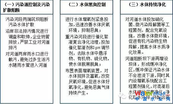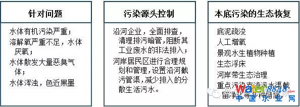 原水——水體凈化劑——增氧劑——催化絮凝劑——高效工程菌劑——生物強(qiáng)化修復(fù)——合格排放——水體排空底泥清淤——河道恢復(fù)