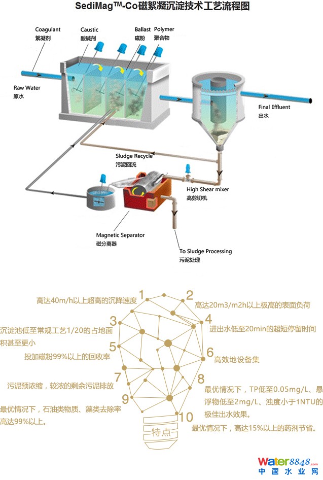 磁絮凝沉淀技術(shù)是在傳統(tǒng)絮凝沉淀和化學(xué)沉淀工藝的基礎(chǔ)上,增加了磁粉的投入,使得磁粉和絮體進(jìn)行高效共沉,而磁粉則通過