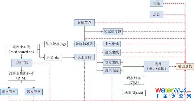 市政綜合項目尤其改造項目涉及專業(yè)廣泛,包括道橋水暖涵,雨污訊電燃等,各專業(yè)相互獨(dú)立同時又需要密切配合。施工圖的繪制,未采用協(xié)同平臺的情況下,各專業(yè)除了內(nèi)部校審還需要相互會簽以保證圖紙及設(shè)計的嚴(yán)謹(jǐn)性,各專業(yè)將自身設(shè)計交付到管線綜合人員,管綜結(jié)果反饋給各設(shè)計師,各專業(yè)根據(jù)管綜調(diào)整設(shè)計并進(jìn)行“返圖”(將其他專業(yè)管線反饋到本圖紙)。而不論是否采用協(xié)同平臺,由于二維圖紙中常采用標(biāo)高表述管線之間或管線與構(gòu)筑物之間相互關(guān)系,不能體現(xiàn)管道壁厚,無法直接準(zhǔn)確度量相互之間凈距,導(dǎo)致管綜成為進(jìn)度控制因素,而設(shè)計變更時管線綜合顯得更為重要。管綜工程師存在任務(wù)重、責(zé)任大、風(fēng)險高的特點(diǎn)。一旦管綜人員不再跟進(jìn)該項目,接手人員需要較長時間熟悉項目,處理項目上的問題則需要更長的時間。亟需能準(zhǔn)確表達(dá)、直觀表現(xiàn)、能與設(shè)計互動的工作流程,同時,要體現(xiàn)“設(shè)計的生命周期”。