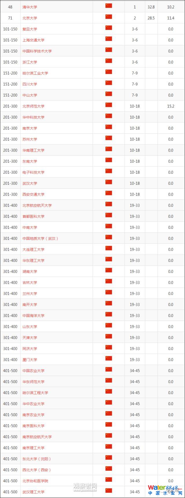 中國高校排名穩(wěn)步提升。繼2016年躍入世界百強后,清華大學今年再次取得突破,位列全球第48名;北京大學則位列71名,仍保持世界百強之列。其后,復旦大學、上海交通大學、中國科學技術大學、浙江大學等幾大名校均排在第101-150名的區(qū)間。