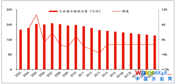 2003-2020年中國(guó)工業(yè)廢水排放總量及增速