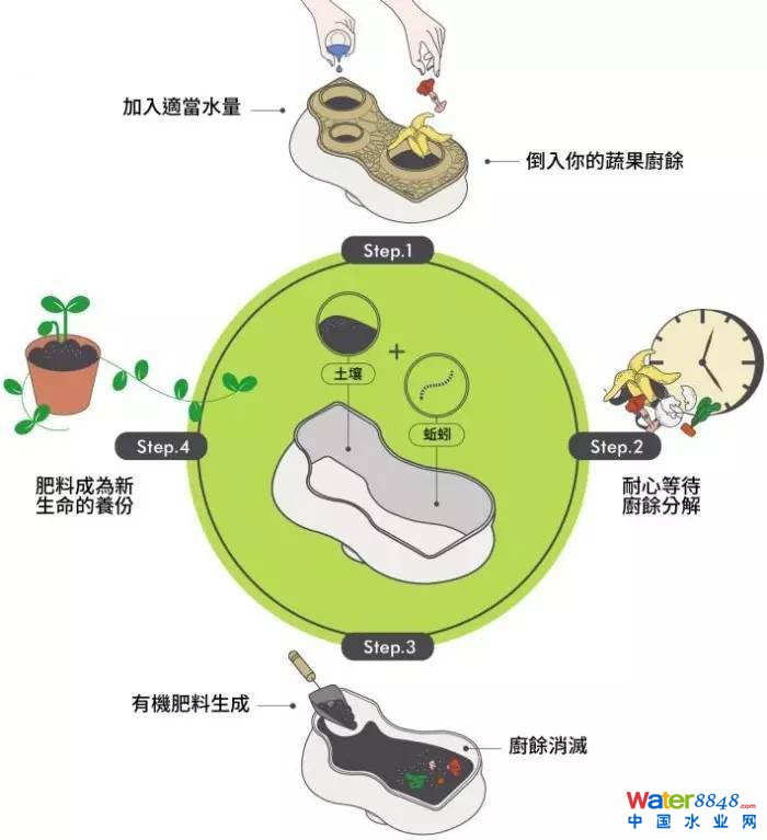 使用者每天可在BIOVESSEL投入500克如小黃瓜頭、果皮等生廚余,經(jīng)過(guò)適當(dāng)澆水,維持一定濕度,透過(guò)紅蚯蚓消化、分解、排便后,即可生成天然有機(jī)肥,提供植物所需,整個(gè)過(guò)程全不耗電。
