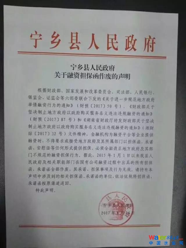今天(8月23日),網(wǎng)上流傳一份寧鄉(xiāng)縣人民政府關于融資擔保函作廢的聲明刷屏朋友圈,與以往撤函不同的是,這次地方政府撤函顯得簡單粗暴,直接宣布所有擔保函、承諾函全部作廢!度A夏時報》記者從與相關機構(gòu)處證實了此函的真實性。