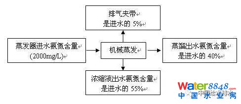 進入蒸發(fā)器后的氨氮通過三個途徑排出蒸發(fā)器:蒸餾出水、濃縮液出水、排氣夾帶。由于氨在水中的溶解度極大,所以排氣中夾帶氨量很少,蒸發(fā)之后的氨氮主要存在于濃縮液和蒸發(fā)出水中。因此蒸發(fā)工藝出水氨氮含量高,一般不能達到排放標準的要求,需增加后續(xù)去除氨氮的設(shè)施。以進水氨氮2000mg/L計算為例,其平衡圖見圖1。由于蒸發(fā)之后的氨氮含量仍遠遠高于排放標準的要求,因此蒸發(fā)后必須進行脫氮處理。目前國內(nèi)常用的方法是采用離子交換法去除氨氮。