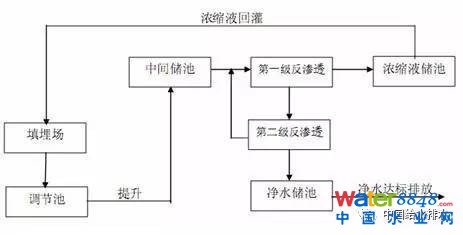 滲濾液直接進行膜分離技術(shù)是指滲濾液不進行生化處理,經(jīng)過簡單的預(yù)處理后直接進入反滲透處理系統(tǒng),反滲透清液出水達標排放,產(chǎn)生的濃縮液回灌填埋場或送城市污水處理廠,其工藝流程見圖2。