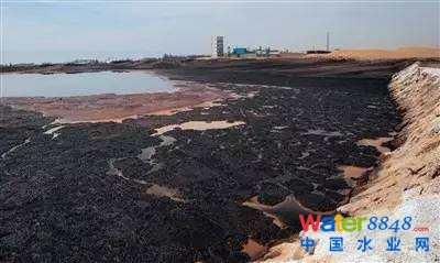 ▲2014年8月29日,寧夏明盛染化有限公司廠區(qū)外東側(cè)騰格里沙漠滲坑內(nèi)存有大量工業(yè)廢水。圖片來自新京報網(wǎng)