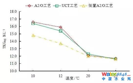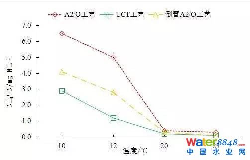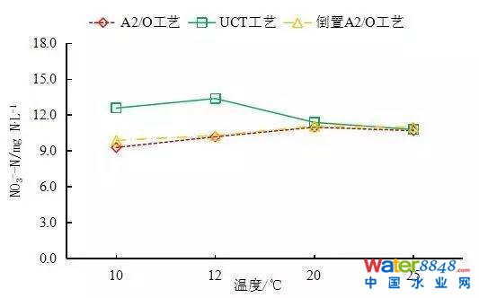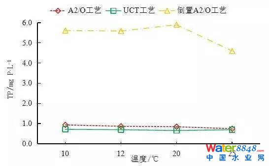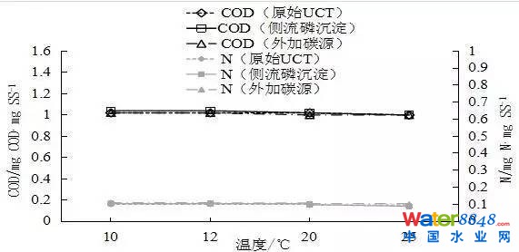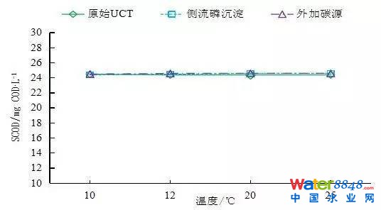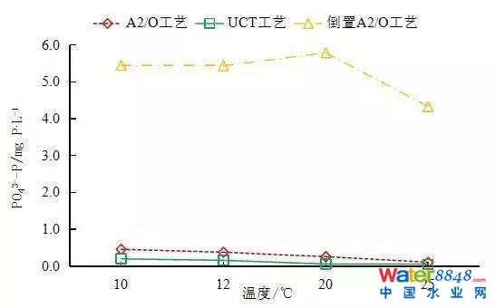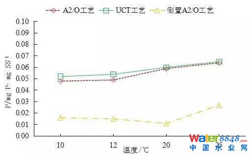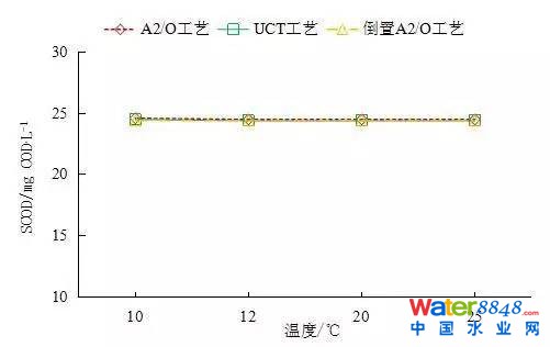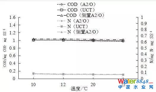 圖4顯示,各溫度下三種工藝對COD去除幾近一致,出水中溶解性SCOD≤25 mg/L。NH4+-N硝化能力在20 ℃以下時UCT明顯高于A2/O,比倒置A2/O亦好許多。因各工藝反硝化能力受碳源(COD)限制,20 ℃以下時UCT硝化產(chǎn)生的較多的NO3--N不能及時反硝化,以至于比其它兩個工藝高1~3 mg/L。就TN而言,因各工藝SS中所含N成分不盡相同,20 ℃以下時倒置A2/O要比其它兩個工藝低1~2 mg /L。無論溶解性PO43-還是TP,倒置A2/O表現(xiàn)均很差,幾乎不具有生物除磷能力;而UCT在生物除磷方面要勝于A2/O。