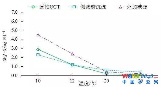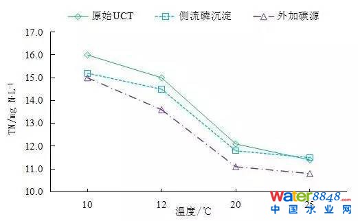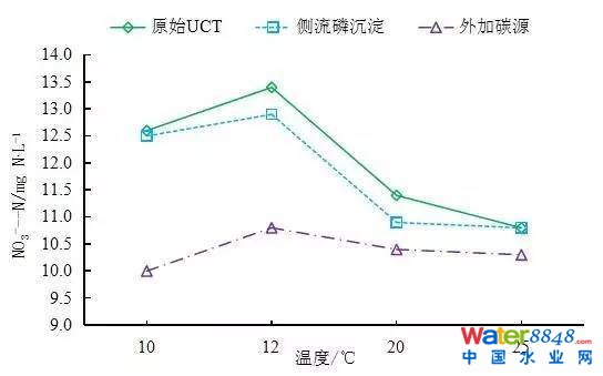 UCT因避免了回流污泥中NO3-對厭氧單元PAOs/DPB的影響(競爭VFAs),所以,顯示出比A2/O更好的生物除磷能力。此外,因UCT進(jìn)入缺氧單元實際存在兩個循環(huán)(QA+QR),使實際回流比為300%,導(dǎo)致NH4+-N硝化機(jī)會較A2/O無形增加100%,所以,UCT的硝化能力好于A2/O。盡管UCT300%的缺氧回流比理論上亦有助于增加反硝化的機(jī)會,但因碳源(COD)限制而不能將硝化而來的NO3-及時反硝化。