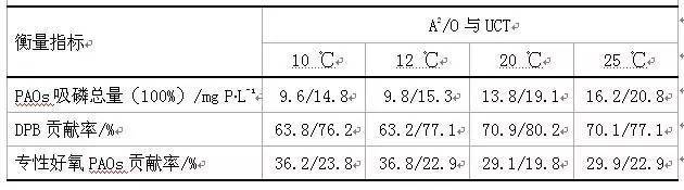 表3顯示,A2/O工藝中PAOs在缺氧以及好氧單元吸磷總量較UCT低22%~35%;UCT中PAOs的吸磷作用在20 ℃以下時作用特別明顯(>30%),應(yīng)主要歸功于DPB的反硝化除磷現(xiàn)象,低溫時表現(xiàn)尤為突出,20 ℃以下時比A2/O高12%~14%。換句話說,UCT工藝生物除磷在很大程度上均以反硝化除磷為主。從這個意義上說,UCT在同步脫氮除磷方面的性能絕對優(yōu)于A2/O。