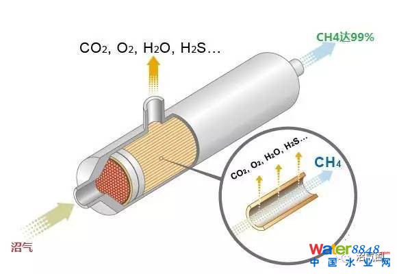 氣相-液吸收膜工藝近年才被用在沼氣凈化上,其實質(zhì)是沼氣中的硫化氫和二氧化碳分子穿過一個多孔的熟睡膜在液相中被吸收去除。從下方進入的氣體,其中的硫化氫和二氧化碳分子能夠擴散穿過膜,然后被相反方向流過的液體吸收,吸收膜在一個標(biāo)準(zhǔn)大氣壓下工作。在25℃到35℃,可以非常有效地把沼氣中的硫化氫濃度從2%減少到小于250ppm,液相的吸收劑可以用NaOH溶液。吸收了硫化氫的NaOH溶液可以應(yīng)用于水處理中以去除重金屬。二氧化碳可以通過胺溶液作液相去除,胺溶液可以通過加熱再生,釋放處純凈的二氧化碳可作工業(yè)應(yīng)用。