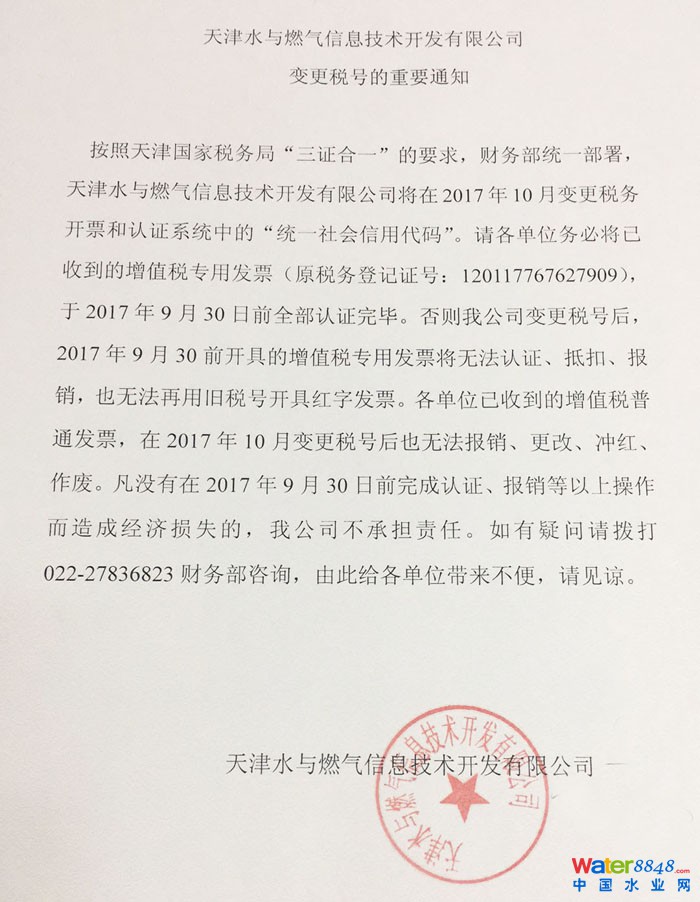 按照天津國家稅務局“三證合一”的要求,財務部統(tǒng)一部署,天津水與燃氣信息技術開發(fā)有限公司將在2017年10月變更稅務開票和認證系統(tǒng)中的“統(tǒng)一社會信用代碼”。請各單位務必將已收到的增值稅專用發(fā)票(原稅務登記證號:120117767627909),于2017年9月30日前全部認證完畢。否則我公司變更稅號后,2017年9月30前開具的增值稅專用發(fā)票將無法認證、抵扣、報銷,也無法再用舊稅號開具紅字發(fā)票。各單位已收到的增值稅普通發(fā)票,在2017年10月變更稅號后也無法報銷、更改、沖紅、作廢。凡沒有在2017年9月30日前完成認證、報銷等以上操作而造成經(jīng)濟損失的,我公司不承擔責任。如有疑問請撥打022-27836823財務部咨詢,由此給各單位帶來不便,請見諒。