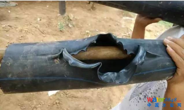 ⑶當(dāng)高處水源的水,利用重力流按一定的速度向下游輸送時(shí),急速關(guān)閉上游的閥門后,由于落差及流速的慣力,管道內(nèi)上游的水柱并沒有立即停止,它仍按一定的速度向下游流動(dòng),此時(shí)管道內(nèi)因無法及時(shí)補(bǔ)氣形成真空,造成管道被負(fù)壓吸癟而破損。