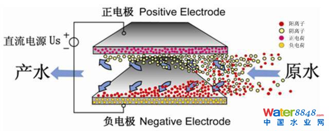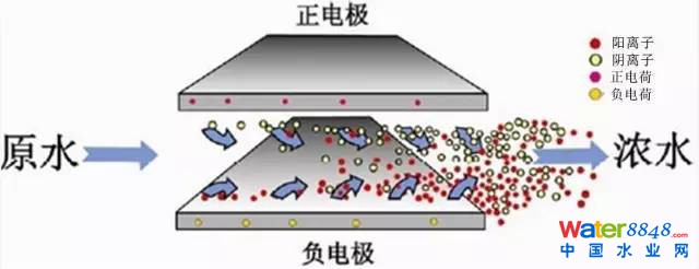 水處理中,水中的鹽大多是以陰陽離子(或稱正負(fù)離子)的形式存在。所謂“電化學(xué)中的雙電層理論”,就相當(dāng)于在水中安裝一個(gè)平板電容,通過施加外加電壓形成靜電場(chǎng),兩個(gè)電極板分別帶正負(fù)電荷,強(qiáng)制離子向帶有相反電荷的電極板上移動(dòng),陰離子向正極板移動(dòng)并聚集,陽離子向負(fù)極板移動(dòng)并聚集,這樣使水體本身鹽度降低,實(shí)現(xiàn)了除鹽的效果。