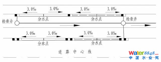 《城市道路設(shè)計規(guī)范》中規(guī)定,當(dāng)?shù)缆分行木縱坡度小于0.3%時,為保證路面排水,宜在道路兩側(cè)車行道邊緣1~3m寬度范圍內(nèi)設(shè)鋸齒形偏溝,或采用加密雨水口設(shè)置方式;在平坡路段全程設(shè)置(。┯晁凇4藭r雨水口數(shù)量一般均能滿足雨水徑流量要求,采用何種雨水口的布置形式,適合工程具體情況顯得尤為重要。