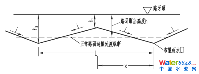 (2)方案二:維持道路縱坡不變,設(shè)置鋸齒型偏溝。在兩側(cè)行車道邊緣設(shè)置鋸齒形偏溝,在保持道路中線、縱坡設(shè)計線與側(cè)石頂面線平行的條件下,交替的改變側(cè)石頂面線與路面邊緣之間的高度,在最低處設(shè)置雨水口,使偏溝范圍的路面縱坡度增大到0.3%以上,從而達(dá)到縱向排水要求,如圖1所示。