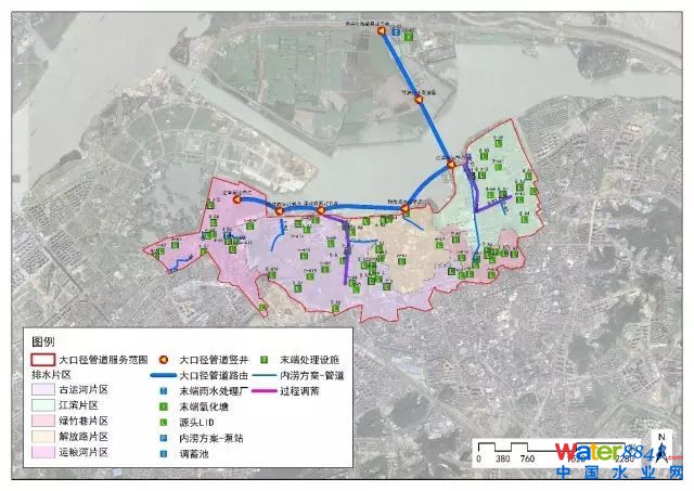 (3)末端集中雨水處理設(shè)施工程:近期規(guī)模10萬m3/d,遠(yuǎn)期規(guī)模20萬m3/d;