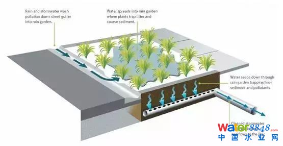 雨水花園是一個(gè)術(shù)語,通常被用于描述一個(gè)植被繁茂的區(qū)域,從雨水徑流當(dāng)中去除污染物質(zhì)(也稱為生物滯留系統(tǒng))。雨水流入到花壇中,通過一層工程土進(jìn)行過濾。凈水被收集在有溝槽的管道中并引到傳統(tǒng)的排水系統(tǒng)中。這個(gè)表面會(huì)留住雨水徑流中的垃圾、樹葉和沉積物,同時(shí)土壤(和植物根部系統(tǒng)結(jié)合)幫助過濾和分解微觀污染物例如營養(yǎng)物、重金屬和碳?xì)浠衔。設(shè)計(jì)雨水花園是利用它在頻繁的低強(qiáng)度降雨中過濾污染物。傳統(tǒng)的排水系統(tǒng)依然需要適應(yīng)稀少的較大型降水,防止洪澇災(zāi)害。