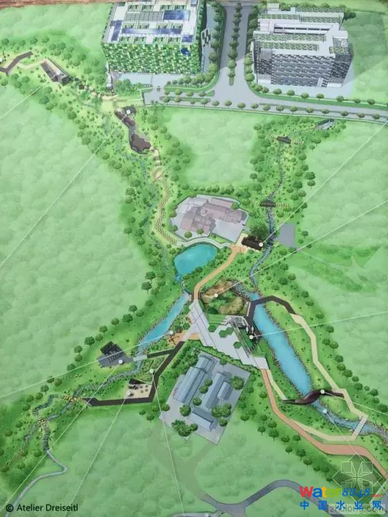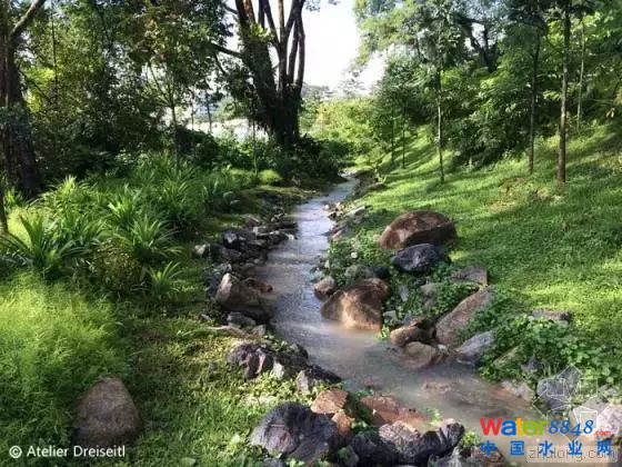 現(xiàn)有的生態(tài)棲息地,包括草地、林地和泥炭沼澤區(qū)都被盡可能地保留,F(xiàn)存的野生動(dòng)物物種被記錄,通過增加的植被種植,為野生動(dòng)植物提供食物和棲息地,將場地與更大范圍的周邊環(huán)境相連,特別是跨越南洋大道的北部森林區(qū)域,自然野生動(dòng)物廊道功能被增強(qiáng)。同樣,自然地形會(huì)被盡可能多地加以保留,并與新加坡公用事業(yè)局的“活躍、美觀、潔凈”(Active,Beautiful,Clean)水域方案理念相呼應(yīng)。該ABC水域方案將被實(shí)施,以支持場地內(nèi)現(xiàn)有的水文流動(dòng)。生態(tài)洼地將凈化雨水,并將之從路邊排水渠道引流至中央核心區(qū)。在那里,一系列的沼澤和池塘將收集和保存雨水。這些雨水將通過生態(tài)凈化群落加以循環(huán),以進(jìn)行進(jìn)一步的凈化,被重新利用成為廁所沖刷用水。