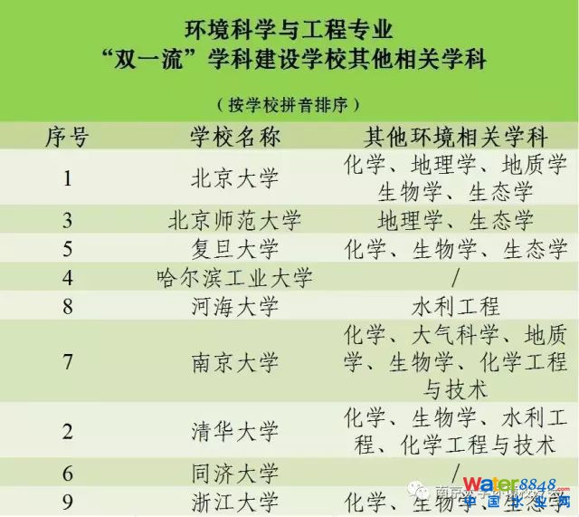 “雙一流”名單中包括42所一流大學(xué)建設(shè)高校和95所一流學(xué)科建設(shè)高校,其中,僅有北大、北師大、復(fù)旦、哈工大、河海、南大、清華、同濟(jì)、浙大9所高校的環(huán)境工程與科學(xué)專業(yè)入選一流學(xué)科建設(shè)。