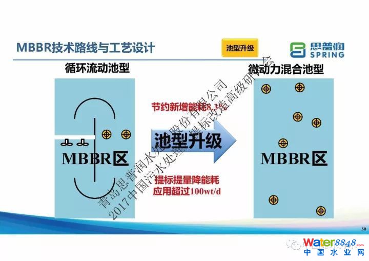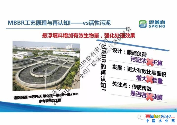 第二個是介紹MBBR的工藝原理與再認知。我們一想到生化工藝,最初想到的就是活性污泥法,此技術(shù)已經(jīng)發(fā)展百年,所以我們總習(xí)慣拿活性污泥法跟MBBR工藝作比較。實際它跟活性污泥法有聯(lián)系也有區(qū)別。首先說聯(lián)系方面,它們的動力來源相同,好氧階段都是通過爆氣實現(xiàn),MBBR技術(shù)的泥膜負荷工藝有污泥回流,運行方式、工藝布置流程相似。再說區(qū)別方面,傳統(tǒng)活性污泥法由于通過剩余污泥排放控制泥齡,是一個單泥齡系統(tǒng);MBBR工藝是一個雙泥齡的系統(tǒng),有固定態(tài)泥齡也有懸浮態(tài)泥齡,一定程度可以緩解脫氮除磷泥齡上面矛盾。傳統(tǒng)的活性污泥法微生物是階段培養(yǎng),比如硝化菌群在好氧曝氣階段實現(xiàn)增殖恢復(fù),在缺氧段又受到抑制;而MBBR是一個專性和連續(xù)的培養(yǎng)過程,生物膜在固定區(qū)域流化培養(yǎng)。MBBR工藝中的微生物固定在填料上,強沖擊來臨時,整個的菌群系統(tǒng)不受影響,沖擊過后整個系統(tǒng)的效能能很快恢復(fù)。再一個就是溶解氧不同,傳統(tǒng)的活性污泥法在溶解氧大于2毫克/L時硝化功能就不受溶解氧影響,此時是一個零級反應(yīng);而MBBR工藝可以看到隨著溶解氧的增加有兩個明顯區(qū)域,不同溶解氧水平下不光有零級反應(yīng),也有一級反應(yīng)的區(qū)間。綜上所述我們認為懸浮填料MBBR工藝泥齡控制方式和活性污泥法不同,抗沖擊原理不同,微生物培養(yǎng)方式不同,溶解氧傳質(zhì)的方式不同,硝化菌群所含的比例不同,硝化菌群比例一般大于10%,最多可以超過70%。所以我們認為懸浮填料是增加和持留有效生物量、強化處理效果,而不僅僅是認為就是增加了MLSS。