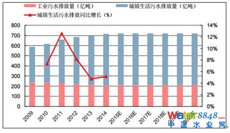我國污水分為工業(yè)和城鎮(zhèn)生活兩部分,中國環(huán)境統(tǒng)計年鑒數(shù)據(jù)顯示,2009年-2014年我國工業(yè)污水排放量基本維持在210億噸/年左右,城鎮(zhèn)生活污水排放量自354億噸增長至510億噸。保守估算,按照工業(yè)污水排放量每年210億噸,城鎮(zhèn)生活污水排放量年增長率4%計算,則2020年我國污水排放總量將達到855億噸。2014年,我國工業(yè)污水有效處理率為96%,城鎮(zhèn)生活污水有效處理率為97%,2014年工業(yè)污水處理量為200億噸,城鎮(zhèn)生活污水處理量為495億噸。假設(shè)污水有效處理率保持不變,則2020年工業(yè)污水處理量為200億噸,城鎮(zhèn)生活污水處理量為626億噸。