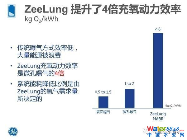 關(guān)于充氧動(dòng)力效率,ZeeLung也遠(yuǎn)遠(yuǎn)高于傳統(tǒng)的表曝和微孔曝氣,典型ZeeLung可以做到微孔曝氣的四倍效果。同時(shí)由于ZeeLung的傳氧是從膜孔直接到生物膜界面,不存在傳統(tǒng)意義上的清水/污泥曝氣效率問(wèn)題.整體來(lái)說(shuō)ZeeLung理論效率可以是百分之百,所以基于這一點(diǎn)可以獲得高效的氧氣利用率,換句話說(shuō)也就是降低了整體的運(yùn)行電耗。針對(duì)A2O工藝來(lái)說(shuō),我們只需要將ZeeLung放在缺氧池,強(qiáng)化硝化和反硝化作用,后續(xù)的好氧生化池容積將會(huì)有30%到50%的處理水量余量。所以在現(xiàn)有占地不需要增加和傳統(tǒng)二沉池的回流比保持不變的條件下,通過(guò)MABR可以提高水質(zhì)同時(shí)提高水量。
