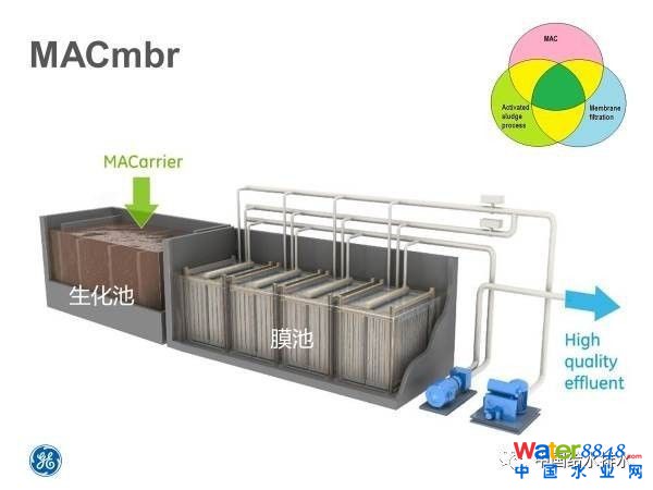 這種短流程工藝,實(shí)現(xiàn)MAC載體與MBR的完美耦合,實(shí)現(xiàn)1+1+1>3。MACmbr關(guān)鍵在于GE MBR采用的獨(dú)特的MAC載體特性、加強(qiáng)型ZeeWeed超濾膜、專利的曝氣及清洗工藝,在投加MAC載體的同時(shí),不犧牲MBR通量和壽命等性能。相比其他的競(jìng)爭(zhēng)工藝,在固定投資和運(yùn)營(yíng)成本上都更有優(yōu)勢(shì)。在典型ZeeWeed MBR系統(tǒng)上增加MAC投加系統(tǒng),系統(tǒng)生化調(diào)試時(shí)投加設(shè)定的劑量,在后續(xù)的運(yùn)行中會(huì)根據(jù)污泥齡(SRT)和來(lái)水COD 的波動(dòng)來(lái)調(diào)整補(bǔ)充的MAC投加量。在典型市政MBR系統(tǒng)中, MBR出水COD會(huì)小于30mg/l,且基本在20-30波動(dòng),所以要達(dá)到準(zhǔn)III類或準(zhǔn)II類水質(zhì)要求,MAC的日常投加量將是一個(gè)靈活的操作值,這有利于運(yùn)行成本的最小化。而對(duì)于含有工業(yè)廢水的城鎮(zhèn)污水廠,要達(dá)到I級(jí)A或準(zhǔn)IV類水質(zhì)要求,也可采用MACmbr實(shí)現(xiàn)這一目標(biāo)。