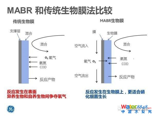 接下來(lái)看MABR。MABR英文全稱是Membrane Aerated Biofilm Reactor,直接翻譯很多人會(huì)理解成“膜曝氣生物膜反應(yīng)器”,但我們認(rèn)為這并不能完全表達(dá)這個(gè)技術(shù)本身,所以我們把MABR稱為“膜傳氧生物膜反應(yīng)器”。為什么這樣說(shuō)呢?我們的MABR產(chǎn)品的商標(biāo)是ZeeLung,英文Lung是肺的意思,意味著我們用膜來(lái)進(jìn)行傳氧。這實(shí)際上是用高效的氧氣擴(kuò)散膜來(lái)實(shí)現(xiàn)氧的傳遞,即是一個(gè)無(wú)泡曝氣過(guò)程。通過(guò)中空纖維膜傳氧,然后在中空纖維膜上再長(zhǎng)生物膜實(shí)現(xiàn)好氧生物處理。這與傳統(tǒng)的生物膜工藝是完全不同的:左邊傳統(tǒng)生物膜介質(zhì)上面長(zhǎng)生物膜。氧氣和水中有機(jī)物和營(yíng)養(yǎng)物質(zhì)從外進(jìn)入到生物膜,從而存在異養(yǎng)菌和自養(yǎng)菌競(jìng)爭(zhēng)的問(wèn)題,整個(gè)生物膜單元是好氧環(huán)境。而在MABR工藝的生物膜中,氧氣和水中有機(jī)物、營(yíng)養(yǎng)物質(zhì)是對(duì)向傳質(zhì)的,所以MABR的生物膜實(shí)際是一個(gè)硝化生物膜,即異養(yǎng)菌和自養(yǎng)菌不會(huì)產(chǎn)生沖突,這樣比較容易在整個(gè)生物膜界面上更好地進(jìn)行硝化,而在外面混合液中進(jìn)行反硝化,實(shí)現(xiàn)同步硝化反硝化。這實(shí)際上是兩種不同意義上的生物膜工藝技術(shù)。