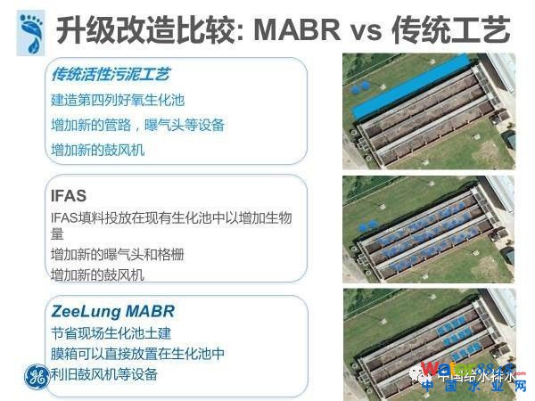 分享一個(gè)實(shí)際工程,這個(gè)項(xiàng)目一期先用了GE的MBR技術(shù)升級(jí)了現(xiàn)有的一半活性污泥法系統(tǒng),處理規(guī)模為8000噸/天。剩下一半傳統(tǒng)活性污泥法只有好氧,但是全廠總氮要做到65%去除,怎么辦?考慮到全廠的能耗節(jié)省,后來(lái)選擇采用MABR技術(shù),剩下一半升級(jí)成AO工藝。最后MBR跟MABR出水勾兌實(shí)現(xiàn)全廠65%的總氮去除。