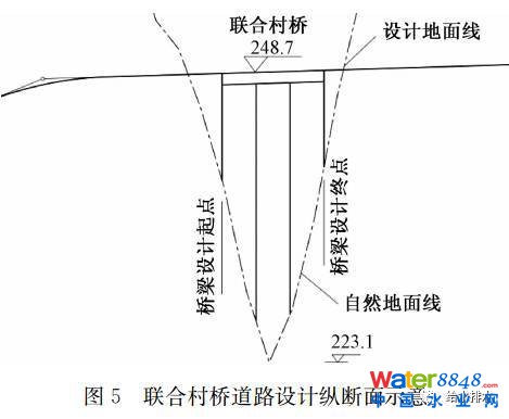 本工程道路依次穿越萬溶江、跳巖河、焦柳鐵路、X047縣道、聯(lián)合村深溝,均通過橋梁的形式穿越,橋梁段道路縱坡如圖3~圖5所示?梢钥闯,山地城市與平原城市相比,河道底或深溝底同道路設(shè)計標(biāo)高差較大,最深處達(dá)25 m以上。