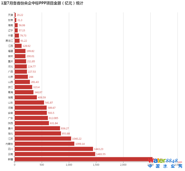 在新疆地區(qū)1-7月份,中國交建、中國建筑兩大巨頭分別以919億元、818億元占據(jù)有利市場,而中國交建則拿下708億新疆地區(qū)最大的PPP項目。